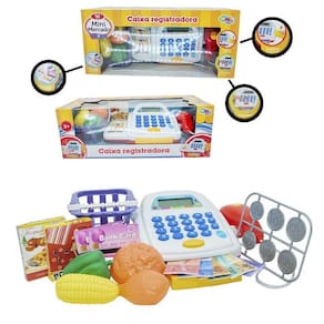 - caixa registradora com gaverta e scanner, calcula de verdade, com som e luz, tamanho aproximado de 22cm de comprimento x 13cm de altura 2 pilhas aa não inclusas ;