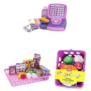 O kit vem com caixa registradora com dinheirinho e mercadinho com frutas, legumes e comidinhas