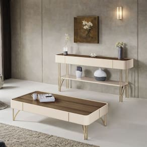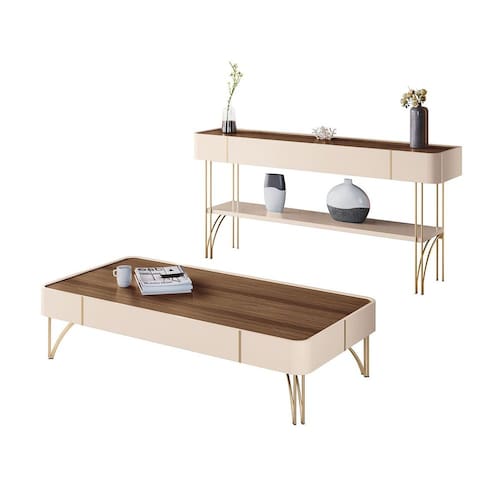 A mesa de centro apresenta cantos arredondados e pés de aço maciço dourado, combinando perfeitamente com o aparador, que possui prateleira inferior robusta e detalhes refinados. Produzidos em MDF de alta qualidade e acabamento premium em Impressão UV Texturizada, ambos garantem durabilidade e requinte para sua decoração.