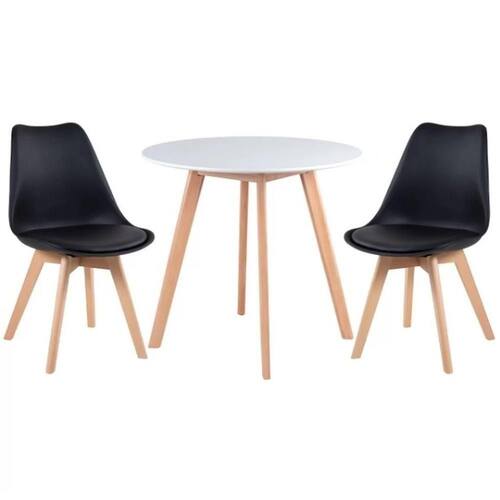 Mesa de Jantar Redonda 90cm Cor: BrancaDiâmetro: 90cm Altura: 75cm Tampo em MDF 2 Cadeiras Leda Charles Eames, Saarinen Wood com almofada Preta Assento em Polipropileno com almofada em PU Base em madeira com acabamento arredondado Largura 49cm Profundidade 43cm Altura até o assento 45cm Altura até o encosto 82cmOBS: Montagem não inclusa. Acompanha manual de instruções e chave para a montagem.