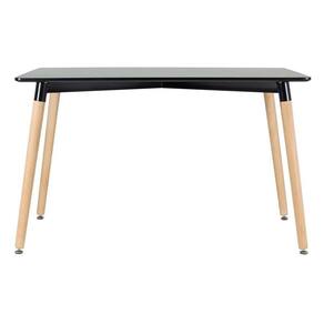 Cadeira modelo Eames DSW: Material do assento: Polipropileno - Material da base: Madeira e aço - Altura do encosto: 81 cm - Altura do assento: 43 cm - Largura do assento: 46 cm - Profundidade do assento: 40 cm - Distância entre os pés: 40 cm - Peso suportado: 130 kg. Mesa de jantar retangular: Material do tampo: MDF laqueado (Laca fosca) - Material dos pés: Madeira natural - Altura: 75 cm - Largura do tampo: 120 cm - Comprimento do tampo: 60 cm - Garantia: 3 meses.