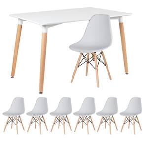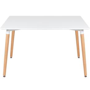 Cadeira modelo Eames DSW: Material do assento: Polipropileno - Material da base: Madeira e aço - Altura do encosto: 81 cm - Altura do assento: 43 cm - Largura do assento: 46 cm - Profundidade do assento: 40 cm - Distância entre os pés: 40 cm - Peso suportado: 130 kg. Mesa de jantar retangular: Material do tampo: MDF laqueado (Laca fosca) - Material dos pés: Madeira natural - Altura: 75 cm - Largura do tampo: 120 cm - Comprimento do tampo: 80 cm - Garantia: 3 meses.