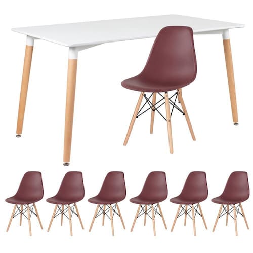 Cadeira modelo Eames DSW: Material do assento: Polipropileno - Material da base: Madeira e aço - Altura do encosto: 81 cm - Altura do assento: 43 cm - Largura do assento: 46 cm - Profundidade do assento: 40 cm - Distância entre os pés: 40 cm - Peso suportado: 130 kg. Mesa de jantar retangular: Material do tampo: MDF laqueado (Laca fosca) - Material dos pés: Madeira natural - Altura: 75 cm - Largura do tampo: 140 cm - Comprimento do tampo: 80 cm - Garantia: 3 meses.