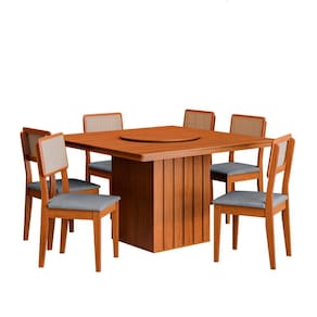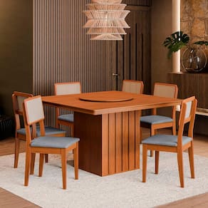 Transforme suas refeições em momentos memoráveis com nossa elegante mesa de jantar de madeira, acompanhada por seis cadeiras confortáveis.