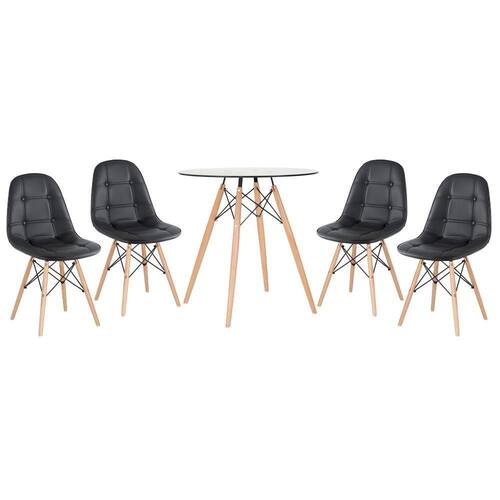 Kit com 1 x mesa de vidro Eames 70 cm + 4 x cadeiras estofadas Eames Botonê. CADEIRAS: Material do assento: Couro PU - Material da base: Madeira e aço - Altura do encosto: 82 cm - Altura do assento: 42 cm - Largura total: 46 cm - Profundidade total: 54 cm. MESA: Material do tampo: Vidro temperado 8 mm - Material da base: Madeira e aço - Altura: 75 cm - Diâmetro do tampo: 70 cm - : 3 meses.