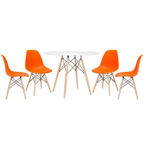 CADEIRAS: Material do assento: Polipropileno - Material da base: Madeira e aço - Altura do encosto: 81 cm - Altura do assento: 43 cm - Largura do assento: 46 cm - Profundidade do assento: 40 cm - Distância entre os pés: 40 cm - Peso suportado: 130 kg. MESA: Material do tampo: MDF laqueado (Laca fosca) - Material da base: Madeira e aço - Altura: 75 cm - Diâmetro: 100 cm.