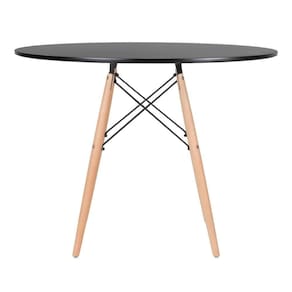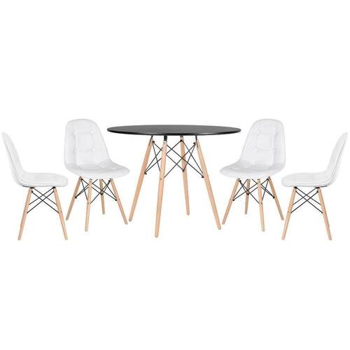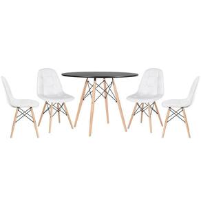 Cadeira Eames Botonê: Material do assento: Couro PU - Material da base: Madeira e aço - Altura do encosto: 82 cm - Altura do assento: 45 cm - Largura do assento: 44 cm - Profundidade do assento: 38 cm - Distância entre os pés: 40 cm - Peso suportado: 130 kg. MESA: Material do tampo: MDF laqueado (Laca fosca) - Material da base: Madeira e aço - Altura: 75 cm - Diâmetro: 100 cm - : 3 meses.