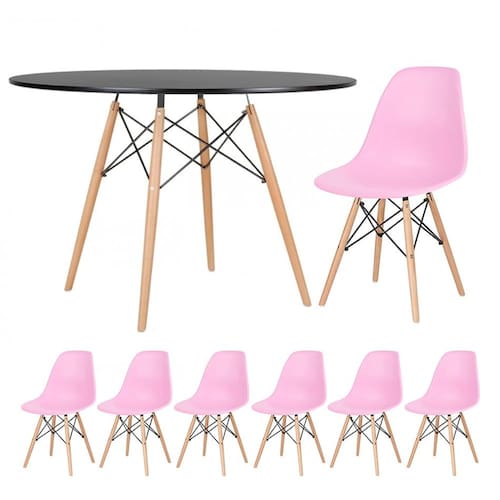 Polipropileno (assento da cadeira), Madeira e aço (base da mesa e cadeiras), MDF laqueado (tampo da mesa)Vendido e entregue por Loft7