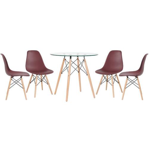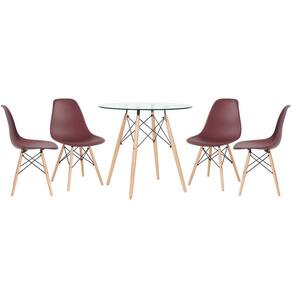 Cadeira modelo Eames DSW: Material do assento: Polipropileno - Material da base: Madeira e aço - Altura do assento: 43 cm - Largura do assento: 46 cm - Profundidade do assento: 40 cm - Distância entre os pés: 40 cm - Peso suportado: 130 kg. Mesa redonda Eames: Material do tampo: Vidro incolor temperado 8 mm - Material da base: Madeira natural e aço - Diâmetro do tampo: 80 cm - Altura: 75 cm - Garantia: 3 meses.