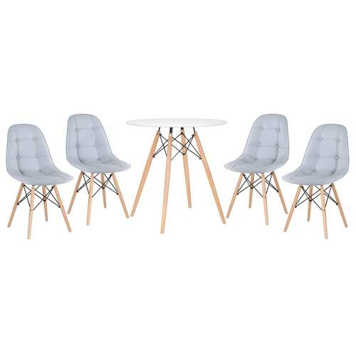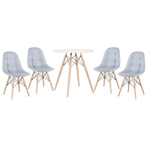 Conjuntocom 1 mesa Eames 70 cm + 4 cadeiras estofadas Eames Botonê. CADEIRAS: Material do assento: CouroPU - Material da base: Madeira e aço - Altura do encosto: 82 cm - Altura do assento: 42 cm - Largura total: 46 cm - Profundidade total: 54 cm. MESA: Material do tampo: MDF laqueado - Material da base: Madeira e aço - Altura: 75 cm - Diâmetro: 70 cm - Garantia: 3 meses