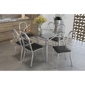 Conjunto: Mesa De Cozinha Elba C/ Tampo De Vidro 120cm + 6 Cadeiras Holanda Cromada - Assento Preto - Kappesberg