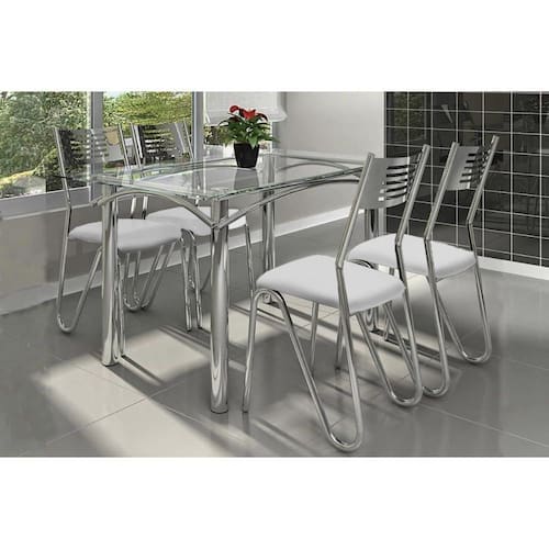 Conjunto: Mesa De Cozinha Elba C/ Tampo De Vidro 140cm + 4 Cadeiras Nápoles Cromado/branco - Kappesberg