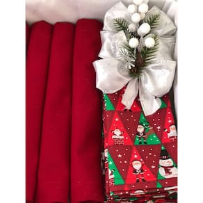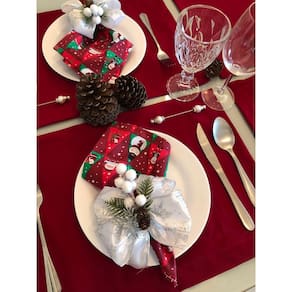 Kit Mesa Posta 12 Lugares Jogo Americano + Guardanapo Decora Estampas.: Jogo Americano Vermelho + Guardanapo Papai Noel Vermelho +Porta Guardanapo Prata Kit Mesa Posta