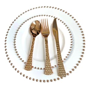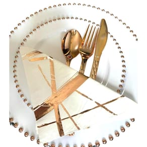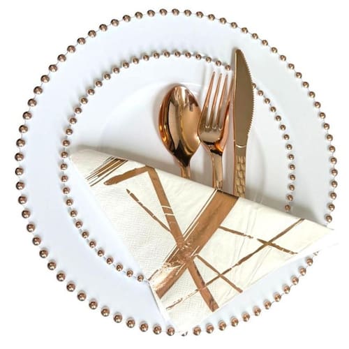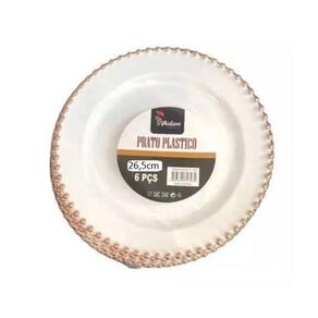 Pratos refeição descartáveis luxo borda bolinhas rose Kit contém: 6 pratos de jantar 26,5cm 6 pratos de sobremesa 19cm 6 garfos 18.8cm 6 facas 20.2cm 6 colheres de sobremesa 19cm 1 pacote com 19un de folhas de guardanapos decorados 33x33cm Branco com detalhes nas bordas rose