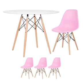 CADEIRAS: Material do assento: Polipropileno - Material da base: Madeira e aço - Altura do encosto: 81 cm - Altura do assento: 43 cm - Largura do assento: 46 cm - Profundidade do assento: 40 cm - Distância entre os pés: 40 cm - Peso suportado: 130 kg. MESA: Material do tampo: MDF laqueado (Laca fosca) - Material da base: Madeira e aço - Altura: 75 cm - Diâmetro: 100 cm.