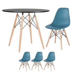 CADEIRAS: Material do assento: Polipropileno - Material da base: Madeira e aço - Altura do encosto: 81 cm - Altura do assento: 43 cm - Largura do assento: 46 cm - Profundidade do assento: 40 cm - Distância entre os pés: 40 cm - Peso suportado: 130 kg. MESA: Material do tampo: MDF laqueado (Laca fosca) - Material da base: Madeira e aço - Altura: 75 cm - Diâmetro: 90 cm.