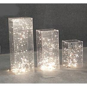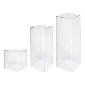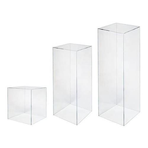 kit de 3 três cubos de acrílico de alta qualidade, 100% puro, não amarela com o tempo e pode ser utilizado ao ar livre. As peças são totalmente transparentes, inteiras, coladas, muito resistentes. Medidas: cubo 1: 30 cm x 30 cm x 40 cm altura cubo 2: 32 cm x 32 cm x 60 cm altura cubo 3: 34 cm x 34 cm x 80 cm altura