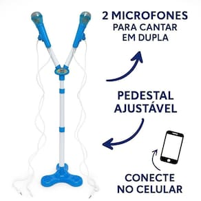 CARACTERÍSTICAS: Material: Plástico Cor: Azul Pode ser conectado ao seu celular para que você coloque as músicas que desejar O tamanho do tripé é ajustável O ângulo do microfone é ajustável
