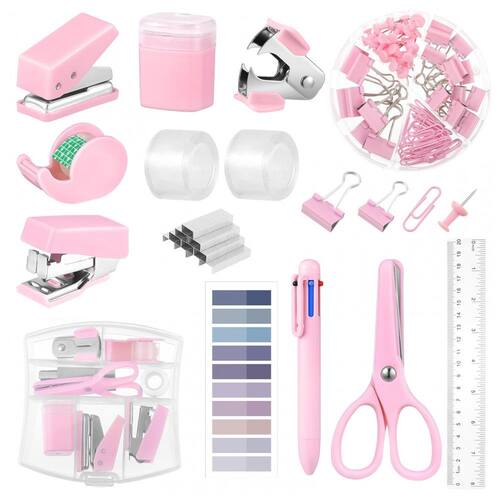O kit mini escritório auroray rosa reúne em um único conjunto grampeador, furador, apontador, extrator de grampos, tesoura, dispenser de fita, régua, bloco adesivo, caneta, clips, binder clips, percevejos e grampos, formando um kit compacto de itens básicos para estudo e rotinas de escritório. As peças combinam componentes em metal e plástico com acabamento em tom rosa uniforme, criando um visual coordenado para mesa de trabalho ou área de estudo. O formato reduzido facilita o transporte em mochilas, bolsas ou pastas, sendo adequado para estudantes, profissionais em deslocamento e uso em espaços com pouco espaço disponível.