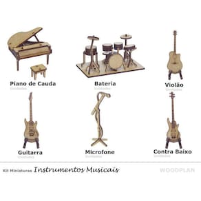 O kit contém: 1 piano com banquinho: 7,5cm de altura x 7,5cm de largura x 8cm de comprimento 1 bateria : 7,5cm de altura x 7,8cm de largura x 13cm de comprimento 1 baixo: 6cm de altura x 2,1cm de largura x 1,8cm de comprimento 1 violão : 6cm de altura x 2,2cm de largura x 1,8cm de comprimento 1 guitarra : 6cm de altura x 2,1cm de largura x 1,8cm de comprimento 1 microfone: 9,5cm de altura x 3,5cm de largura x 3,5cm de comprimento