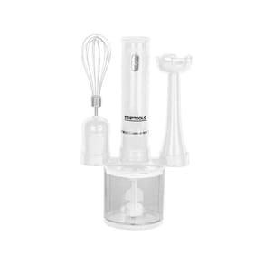 Kit 3 em 1: Mixer de imersão com haste removível em aço inox, mini processador e batedor fouet. Ideal para triturar, bater e misturar alimentos. Design ergonômico e peças removíveis para fácil limpeza. Velocidade variável e manuseio com uma mão.Acompanha copo