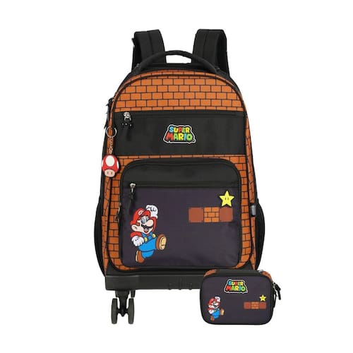 Kit escolar mochila 4 rodas 360º+estojo box super mario mochila com rodas: Confeccionada em poliéster Fechamento em zíper Puxadores personalizados Compartimentos espaçosos 2 bolsos laterais para garrafa Possui rodas e alças de costas reguláveis e alça de mão Design exclusivo Medidas altura: 50 cm largura: 20 cm comprimento: 30 cm Estojo box: