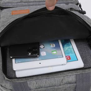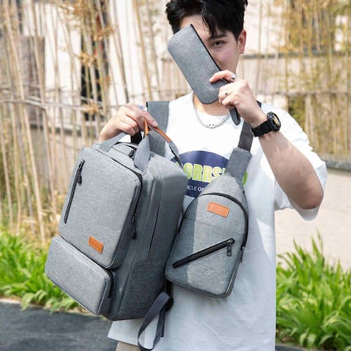 Kit Mochila Academy com bolsa transversal e cecessaire é uma opção muito prática, simples, generosa e durável. O compartimento principal possui um zíper anti roubo escondido para prender seus pertences quando você sair do carro ou sair do metrô. Tem muitos bolsos pequenos no interior para guardar todos os seus pertences essenciais sem ser volumoso. A bolsa também contém um compartimento para computador que pode conter notebooks de até 14 polegadas.