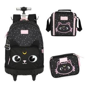 - amplo compartimento principal para melhor organização dos cadernos, livros e apostilas; - 1 compartimentos frontais com fechamento em zíper, para pequenos objetos; - dispõe de alça de mão e alça retrátil reforçada para uma melhor locomoção; - alças acolchoadas e reguláveis caso queira transportar no ombro; - rodinhas de silicone; - chaveiro personalizado - puxadores dos zíperes em borracha; - material: 100% poliéster e forro 100% poliéster.
