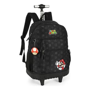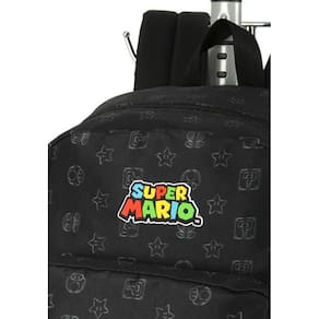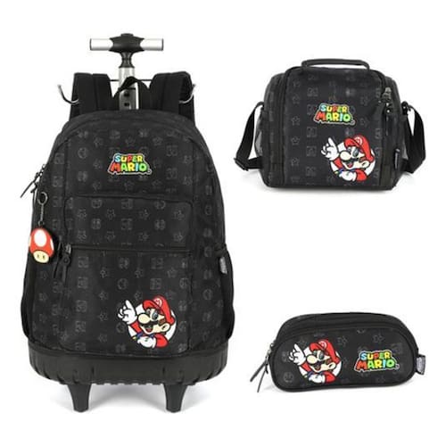 - amplo compartimento principal para melhor organização dos cadernos, livros e apostilas; - 1 compartimentos frontais com fechamento em zíper, para pequenos objetos; - dispõe de alça de mão e alça retrátil reforçada para uma melhor locomoção; - alças acolchoadas e reguláveis caso queira transportar no ombro; - rodinhas de silicone; - puxadores dos zíperes em borracha; - logo super mario; - material: 100% poliéster e forro 100% poliéster.