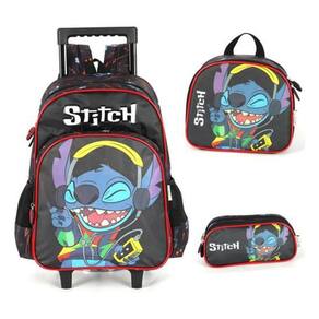 Lançamento escolar volta as aulas 2026 Descrição: Esse lindo kit escolar stitch vai fazer sucesso entre a garotada. Esse modelo conta com 2 compartimentos principais e dois bolsos laterais para colocar a garrafa. Possui 2 rodinhas de silicone e 2 apoiadores frontais para mantê-la em pé. Sua haste metálica é retrátil. Informações mochila com rodinhas; Medidas: altura: 41cm x largura: 31cm x profundidade: 15cm. Peso: 700gr. Capacidade: 21l. Identificador personalizado. Logo em pvc alto relevo Bolso frontal transparente em pvc Puxadores personalizados. Material: 30% pvc 70% poliéster. Altura da alça retrátil fechada: 45cm. Altura da alça retrátil aberta: 73cm. Informações lancheira térmica; Medidas: altura: 19cm x largura: 23cm x profundidade: 10cm Peso: 300gr Capacidade: 5l Material: 30% pvc 70% poliéster Obs: não acompanha garrafa/potinho Informações estojo; Medidas: altura: 10cm x largura: 22cm x profundidade: 8cm Peso: 100gr Material: 30% pvc 70% poliéster de 6 meses contra defeitos de fabricação. Dicas e cuidados; Proteja os objetos pontiagudos ou cortantes evitando o contato direto com o produto. Guarde o produto e um local seco, fresco e arejado, para evitar a proliferação de fungos que podem danificar o produto. Para limpeza, use apenas água morna e sabão neutro nas partes metálicas somente uma flanela seca. Nunca aplique produtos abrasivos, solventes ou quaisquer agentes químicos. Para secagem, utilize apenas pano seco. Não exponha ao sol e altas temperaturas por um período de tempo prolongado. Apare sempre os fios soltos do tecido, para que eles não se prendam no zíper. Duvida Faça-nos uma pergunta : Marca: Não Informado