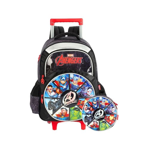 Kit escolar mochila com rodas+lancheira térmica avengers mochila rodas: Possui rodas e alças de costas Confeccionada em poliéster Possui 3 compartimentos espaçosos Fechamento em zíper Dois bolsos laterais telados Etiqueta de identificação na parte traseira Puxadores personalizados