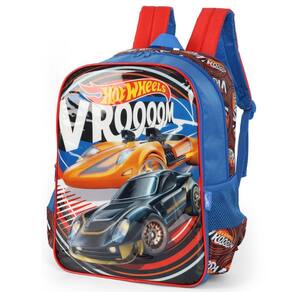 MOCHILA A mochila de costas oficial da Hot Wheels é confeccionada em poliéster estampada e seu painel frontal é em PVC com estampa dos carros Hot Wheels. - Possui dois compartimentos espaçosos com fechamento em zíper e dois bolsos laterais telados. - Possui alça de mão e alças traseiras acolchoadas e reguláveis. - Acompanha etiqueta nas costas para colocar o nome da criança. - Tamanho aproximado: 41 x 30 x 14cm
