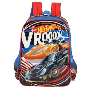 MOCHILA A mochila de costas oficial da Hot Wheels é confeccionada em poliéster estampada e seu painel frontal é em PVC com estampa dos carros Hot Wheels. - Possui dois compartimentos espaçosos com fechamento em zíper e dois bolsos laterais telados. - Possui alça de mão e alças traseiras acolchoadas e reguláveis. - Acompanha etiqueta nas costas para colocar o nome da criança. - Tamanho aproximado: 41 x 30 x 14cm