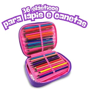 O estojo é funcional e espaçoso, com capacidade para até 36 lápis ou canetas, além de elásticos internos que facilitam a organização dos materiais.