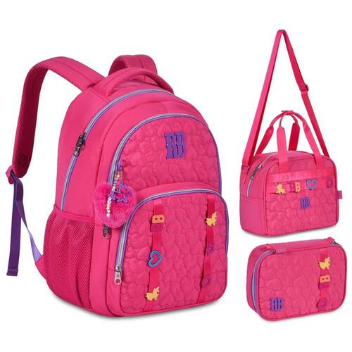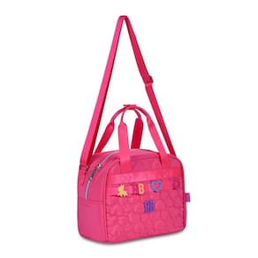 Confeccionadas em material soft texturizado com matelassê personalizado, cadarço acetinado com passadores que se movem. Mochilas com chaveiro de pompom de coração, mascote em plástico vazado e miçangas.