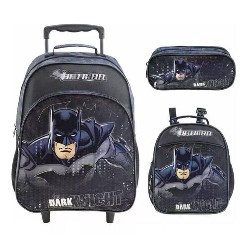 Mochila Com Rodas Batman Com Lancheira E Estojo - Xeryus Mochila de rodas Batman Material em poliéster com logo em PVC patch, bolso frontal com arte de efeito reticular, bolsos laterais com elástico e mesh. Carrinho em metal com travas e rodinhas de silicone. Dados técnicos: Referência: 8830 Largura: 30 cm Altura: 40 cm Profundidade: 15 cm Lancheira Termica Batman Material em poliéster com logo em PVC patch, arte frontal de efeito reticular, alça regulável e forro interno que ajuda a manter o frescor dos alimentos por mais tempo. Dados técnicos: Referência: 8834 Largura: 21 cm Altura: 25 cm Profundidade: 15 cm Estojo Duplo Batman Material em poliéster com logo em PVC patch, arte frontal de efeito reticular e dois compartimentos. Dados técnicos: Referência: 8835 Largura: 21,5 cm Altura: 9 cm Profundidade: 7 cm