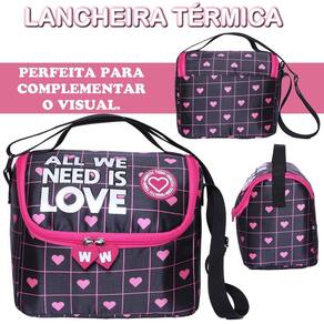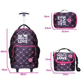 Kit Mochila De Rodinha Bolsa Estojo Lancheira Coração -Preto
