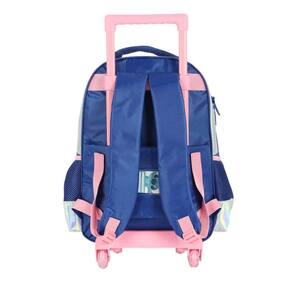 - Mochila com Rodinhas: - Dimensões: 44 cm de altura x 32 cm de largura x 15 cm de profundidade - Peso: 980 g - Cor: Prata holográfica com detalhes do Stitch - Material: Poliéster, durável e fácil de limpar - Compartimentos: 2 compartimentos amplos e bolso lateral para garrafa - Transporte: Pode ser usada como mochila de costas ou puxada pelas rodinhas, com alça de mão e rodinhas reforçadas