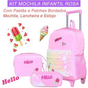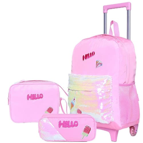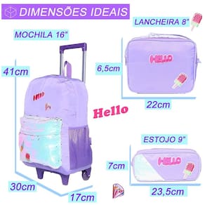 Combinando charme, modernidade e funcionalidade, a mochila de rodinhas infantil feminina é a escolha perfeita para meninas cheias de estilo Este conjunto traz um design único com detalhes encantadores e materiais de alta qualidade, ideal para o dia a dia escolar ou passeios. Características da Mochila: Praticidade e Mobilidade: Conta com rodinhas resistentes para facilitar o transporte e uma alça de mão para maior versatilidade. Design Moderno e Encantador: Bolso externo coberto de paetês brilhantes e patches bordados que dão um toque moderno e estiloso à mochila. Tecido Resistente e Funcional: Confeccionada com material que repele água, garantindo maior proteção aos itens internos. Amplo Espaço Interno: Compartimento principal com zíper, perfeito para acomodar livros, cadernos e outros materiais escolares. Bolsos Laterais: Ideal para garrafinhas ou pequenos objetos, mantendo tudo organizado e acessível. Dimensões da Mochila: 41 cm de altura x 30 cm de largura x 17 cm de profundidade. Lancheira Térmica: Mantém os lanches frescos e prontos para qualquer aventura. Dimensões: 22,5 cm de altura x 18 cm de largura x 9 cm de profundidade. Estojo: Compacto e funcional, perfeito para armazenar lápis, canetas e outros acessórios escolares. Dimensões: 23,5 cm de comprimento x 7 cm de altura. Cuidados com o Produto: Evite carregar excesso de peso para preservar a estrutura da mochila. Não utilize objetos pontiagudos ou cortantes que possam danificar o material. Para limpeza, use apenas um pano úmido com sabão neutro; evite produtos abrasivos ou solventes químicos. Por que escolher esta mochila Estilo e Brilho: A combinação de paetês brilhantes e patches bordados torna esta mochila uma escolha super moderna e cheia de personalidade. Proteção Extra: O tecido repelente à água é perfeito para dias chuvosos ou para evitar acidentes com líquidos. Funcionalidade Total: Perfeita para meninas que precisam de praticidade sem abrir mão de um visual encantador. Seja para a escola ou para um passeio especial, esta mochila de rodinhas é a companheira ideal para momentos inesquecíveis Marca: Não Informado Ean: 9332903209992