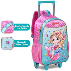kit Mochila Mochilete Sereia Encanto Dos Mares Infantil Escolar 2 em 1 Alças e Rodinhas Tamanho Grande Com Lancheira Térmica Com Garrafinha Potinho e Estojo Duplo A Mochila com Rodinhas Sereia Encanto com a Sereia mais horripilantes vão dar asas a sua imaginação e também a sua Mochila Produzida em Cetim, material brilhante e com toque macio.Possui carrinho em alumínio com alça articulada, deixando a Mochilete mais leve, facilitando o transporte para adultos e crianças. Bolso frontal em cetim com aplicação de glitter, bolsos laterais com elástico para deixar seus objetos favoritos sempre à mão, puxador e identificador no verso para colocar o seu nome. - Carrinho de Alumínio com alça articulada;- Bolso frontal em cetim com aplicação de glitter;- Bolsos laterais em Lycra;- Puxador Personalizado- Alças acolchoadas- Identificador no verso;- Material Principal Cetim;- Lancheira térmica com garrafinha e potinho- Medidas aproximadas mochila: Alt.40cm x Larg.30cm x Prof.15cm - Lancheira térmica com garrafinha e potinho - Medidas lancheira: Altura: 20cm x Largura:16cm x Profundidade:11cm - Estojo duplo