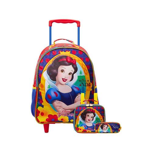 Design da branca de neve: todos os itens possuem um design exclusivo com a personagem favorita das crianças. Mochila com rodinhas: facilita o transporte dos materiais escolares e proporciona mais conforto para a criança. Lancheira: ideal para guardar lanches e bebidas. Estojo duplo: espaço suficiente para organizar lápis, canetas e outros materiais. Zíper resistente: garante maior durabilidade e segurança em todos os itens. Bolsos laterais: ideais para guardar garrafinhas ou outros objetos pequenos. Alça de mão e de costas na lancheira: versatilidade para carregar a lancheira da forma mais confortável. Detalhes personalizados: tornam o kit ainda mais especial e único.