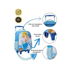 Design da Cinderela com brilho: Todos os itens possuem um design exclusivo com a personagem favorita das crianças e detalhes brilhantes que encantam. Mochila de rodinha: Facilita o transporte dos materiais escolares e proporciona mais conforto para a criança. Lancheira: Ideal para guardar lanches e bebidas. Estojo simples: Espaço suficiente para organizar lápis, canetas e outros materiais. Zíper resistente: Garante maior durabilidade e segurança em todos os itens. Bolsos laterais: Ideais para guardar garrafinhas ou outros objetos pequenos. Alça de mão e de costas: Versatilidade para carregar a lancheira da forma mais confortável. Detalhes personalizados: Tornam o kit ainda mais especial e único. Alças acolchoadas e reguláveis: Adaptam-se perfeitamente às costas da criança.