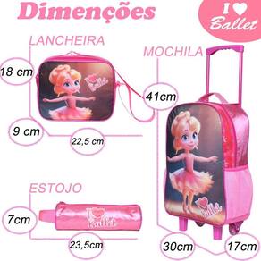 Delicadeza e encanto definem o kit de mochila de rodinhas feminina Com um design em rosa vibrante e glitter sutil, complementado pela estampa de uma linda bailarina, este kit é perfeito para meninas que adoram brilhar e expressar sua paixão pela dança. Características da Mochila: Estilo Elegante: Rosa com glitter suave e estampa de uma bailarina encantadora, trazendo charme e leveza ao dia a dia escolar. Praticidade e Conforto: Rodinhas resistentes para facilitar o transporte. Alça de mão para maior versatilidade. Dois bolsos laterais ideais para garrafas ou itens pequenos de fácil acesso. Espaço e Organização: Compartimento principal grande com zíper, perfeito para armazenar livros, cadernos e outros materiais. Bolso externo adicional para organização extra. Dimensões: 41 cm de altura x 30 cm de largura x 17 cm de profundidade. Características da Lancheira: Isolamento Térmico: Mantém os alimentos frescos e protegidos para a hora do lanche. Divisão Única: Espaçosa e prática para armazenar refeições e snacks. Dimensões: 22,5 cm de altura x 18 cm de largura x 9 cm de profundidade. Características do Estojo: Compacto e Funcional: Divisão única para organizar lápis, canetas e outros acessórios escolares. Dimensões: 23,5 cm de comprimento x 7 cm de altura. Por que escolher este kit Design Encantador: A combinação de glitter, rosa e a delicada bailarina tornam este kit um verdadeiro sonho para as pequenas. Funcionalidade Completa: Espaço ideal para manter tudo organizado e à mão, além de materiais duráveis para o uso diário. Praticidade e Elegância: Perfeito para meninas que amam estilo e funcionalidade em um só produto. Transforme o dia a dia escolar em um verdadeiro espetáculo Este kit é a escolha perfeita para meninas que desejam brilhar com graça e praticidade. Marca: Não Informado Ean: 9412903209991