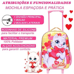 Prepare-se para encantar com o kit de mochila de rodinhas feminina Com uma charmosa estampa de listras, corações e uma adorável gatinha branca, o tema Cat Sweet é perfeito para meninas que amam estilo e fofura. Características da Mochila com Rodas: Design Encantador: Estampa única com listras coloridas, corações e uma linda gatinha branca, trazendo alegria e delicadeza ao visual. Mobilidade e Praticidade: Rodas de silicone resistentes, proporcionando deslocamento suave e silencioso. Alça de mão para maior versatilidade. Espaço e Organização: Compartimento principal amplo com zíper, ideal para acomodar livros, cadernos e materiais escolares. Dois bolsos laterais perfeitos para garrafas ou itens de acesso rápido. Dimensões: 41 cm de altura x 30 cm de largura x 17 cm de profundidade. Características da Lancheira: Isolamento Térmico: Mantém os alimentos frescos e prontos para o consumo. Divisão Única: Espaçosa para organizar lanches e snacks com praticidade. Características do Estojo: Compacto e Funcional: Divisão única para organizar lápis, canetas e acessórios escolares. Dimensões: 23,5 cm de comprimento x 7 cm de altura. Por que escolher este kit Estilo Fofinho e Moderno: A combinação das listras, corações e a delicada gatinha fazem deste kit uma escolha adorável e cheia de personalidade. Funcionalidade e Conforto: Projetado com materiais de alta qualidade, espaço eficiente e recursos que tornam o dia a dia mais prático. Durabilidade e Beleza: Rodas de silicone e materiais resistentes garantem um produto durável e charmoso. Deixe a rotina escolar cheia de doçura e organização Com o tema Cat Sweet, este kit é perfeito para meninas que desejam brilhar em cada detalhe. Marca: Não Informado