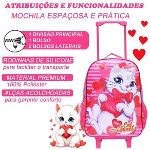 Prepare-se para encantar com o kit de mochila de rodinhas feminina Com uma charmosa estampa de listras, corações e uma adorável gatinha branca, o tema Cat Sweet é perfeito para meninas que amam estilo e fofura. Características da Mochila com Rodas: Design Encantador: Estampa única com listras coloridas, corações e uma linda gatinha branca, trazendo alegria e delicadeza ao visual. Mobilidade e Praticidade: Rodas de silicone resistentes, proporcionando deslocamento suave e silencioso. Alça de mão para maior versatilidade. Espaço e Organização: Compartimento principal amplo com zíper, ideal para acomodar livros, cadernos e materiais escolares. Dois bolsos laterais perfeitos para garrafas ou itens de acesso rápido. Dimensões: 41 cm de altura x 30 cm de largura x 17 cm de profundidade. Características da Lancheira: Isolamento Térmico: Mantém os alimentos frescos e prontos para o consumo. Divisão Única: Espaçosa para organizar lanches e snacks com praticidade. Características do Estojo: Compacto e Funcional: Divisão única para organizar lápis, canetas e acessórios escolares. Dimensões: 23,5 cm de comprimento x 7 cm de altura. Por que escolher este kit Estilo Fofinho e Moderno: A combinação das listras, corações e a delicada gatinha fazem deste kit uma escolha adorável e cheia de personalidade. Funcionalidade e Conforto: Projetado com materiais de alta qualidade, espaço eficiente e recursos que tornam o dia a dia mais prático. Durabilidade e Beleza: Rodas de silicone e materiais resistentes garantem um produto durável e charmoso. Deixe a rotina escolar cheia de doçura e organização Com o tema Cat Sweet, este kit é perfeito para meninas que desejam brilhar em cada detalhe. Marca: Não Informado
