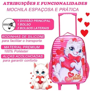 Prepare-se para encantar com o kit de mochila de rodinhas feminina Com uma charmosa estampa de listras, corações e uma adorável gatinha branca, o tema Cat Sweet é perfeito para meninas que amam estilo e fofura. Características da Mochila com Rodas: Design Encantador: Estampa única com listras coloridas, corações e uma linda gatinha branca, trazendo alegria e delicadeza ao visual. Mobilidade e Praticidade: Rodas de silicone resistentes, proporcionando deslocamento suave e silencioso. Alça de mão para maior versatilidade. Espaço e Organização: Compartimento principal amplo com zíper, ideal para acomodar livros, cadernos e materiais escolares. Dois bolsos laterais perfeitos para garrafas ou itens de acesso rápido. Dimensões: 41 cm de altura x 30 cm de largura x 17 cm de profundidade. Características da Lancheira: Isolamento Térmico: Mantém os alimentos frescos e prontos para o consumo. Divisão Única: Espaçosa para organizar lanches e snacks com praticidade. Características do Estojo: Compacto e Funcional: Divisão única para organizar lápis, canetas e acessórios escolares. Dimensões: 23,5 cm de comprimento x 7 cm de altura. Por que escolher este kit Estilo Fofinho e Moderno: A combinação das listras, corações e a delicada gatinha fazem deste kit uma escolha adorável e cheia de personalidade. Funcionalidade e Conforto: Projetado com materiais de alta qualidade, espaço eficiente e recursos que tornam o dia a dia mais prático. Durabilidade e Beleza: Rodas de silicone e materiais resistentes garantem um produto durável e charmoso. Deixe a rotina escolar cheia de doçura e organização Com o tema Cat Sweet, este kit é perfeito para meninas que desejam brilhar em cada detalhe. Marca: Não Informado Ean: 9442903209998