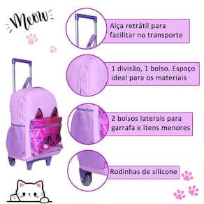 Este kit de mochila de rodinhas feminina é a combinação perfeita de encanto, praticidade e estilo Com um design encantador em rosa com glitter sutil, estampa fofa de gatinho e detalhes holográficos no bolso externo, ele é ideal para meninas que amam brilhar e se destacar. Características da Mochila: Design Encantador: Rosa com glitter suave e estampa de um adorável gatinho que conquista corações. O bolso externo com detalhes holográficos dá um toque moderno e mágico. Praticidade e Conforto: Rodinhas resistentes para facilitar o transporte. Alça de mão funcional para maior versatilidade. Dois bolsos laterais perfeitos para garrafas ou itens de fácil acesso. Organização Essencial: Compartimento principal amplo para guardar materiais escolares. Bolso externo com zíper para itens menores. Dimensões: 41 cm de altura x 30 cm de largura x 17 cm de profundidade. Características da Lancheira: Isolamento Térmico: Mantém os lanches frescos e prontos para o consumo. Praticidade em Tamanho Compacto: Uma divisão espaçosa para alimentos e bebidas. Dimensões: 22 cm de comprimento x 6,5 cm de altura. Características do Estojo: Compacto e Prático: Divisão única perfeita para armazenar lápis, canetas e pequenos acessórios escolares. Dimensões: 23,5 cm de comprimento x 7 cm de altura. Por que escolher este kit Estilo Encantador: O glitter, o gatinho e os detalhes holográficos tornam este kit um acessório único e adorável para qualquer ocasião. Funcionalidade e Conforto: Com espaço suficiente e design prático, ele é perfeito para manter tudo organizado. Durabilidade Garantida: Feito com materiais de alta qualidade, é ideal para acompanhar as crianças em sua rotina diária. Leve brilho e fofura para o dia a dia escolar Este kit é perfeito para meninas que desejam unir estilo, praticidade e um toque mágico em cada detalhe. Marca: Não Informado