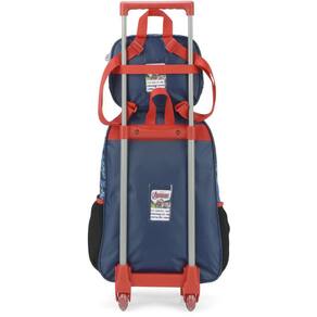 Kit mochila de rodinhas com bolsos laterias em tela com elástico, alças de costas espumadas e reguláveis, silk frontal, bolso frontal com zíper, alça de mão. Lancheira estampada com alça de costas e alça de mão, além de etiquetas personalizadas.
