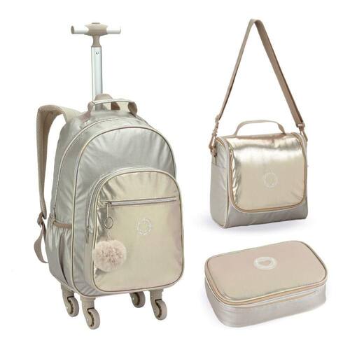 Kit Mochila de Rodinhas + Lancheira + Estojo Just Love DENLEX Dourado -