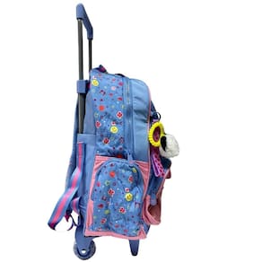 MOCHILA - Confeccionada em material soft, estampa personalizada e detalhes exclusivos. - Os puxadores dos zíperes são personalizados. - Possui bolso amplo e fechamentos em zíper independentes, bolsos frontais e bolsos laterais telados. - Possui alças de costas reguláveis. - Bolso nas costas para guardar as alças quando não usadas. - Seu puxador é firme e bem resistente. - Rodinhas na parte traseira, com apoio frontal. - Tamanho aproximado sem considerar haste e rodinhas: 41cm altura x 31cm largura x 13cm profundidade